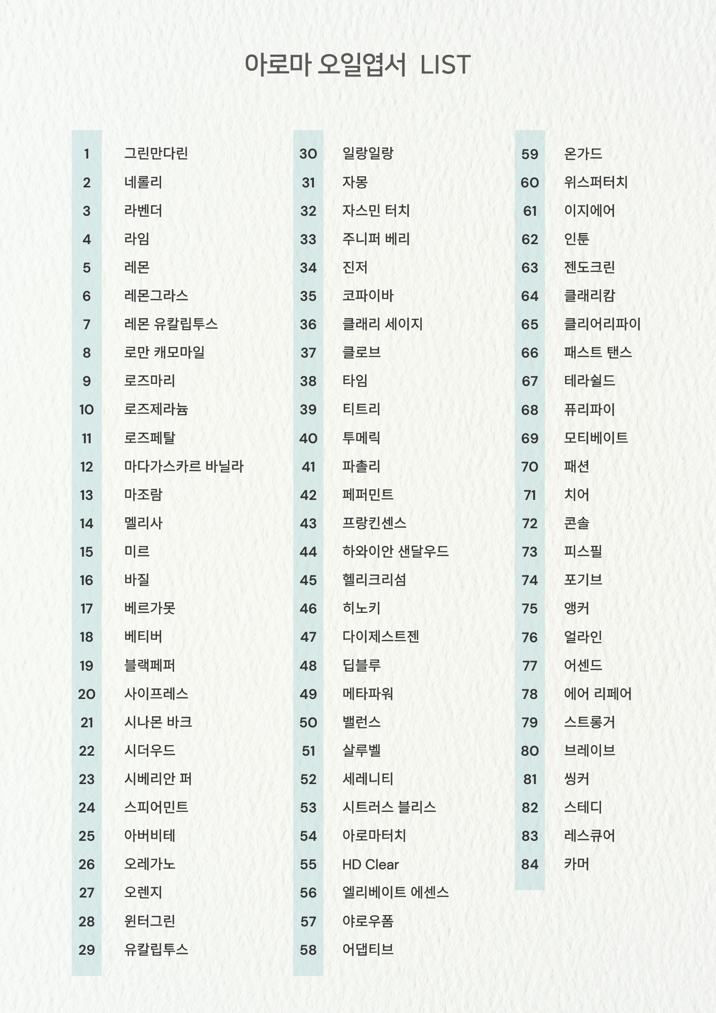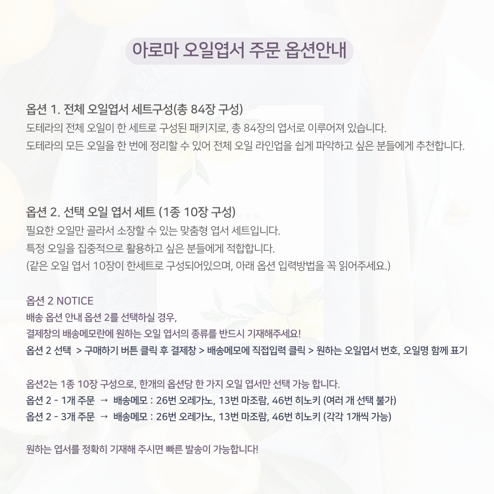 - 필요한 오일만 골라서 소장할 수 있는 맞춤형 엽서 세트입니다. 특정 오일을 집중적으로 활용하고 싶은 분들에게 적합합니다.
